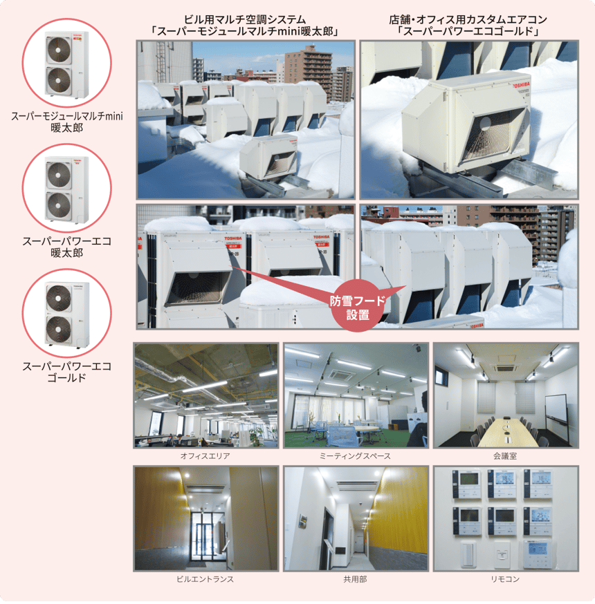 ビル館内の空調設備としてビル用マルチ空調システム「スーパーモジュールマルチmini暖太郎」、店舗・オフィス用カスタムエアコン「スーパーパワーエコ暖太郎」「スーパーパワーエコゴールド」を採用