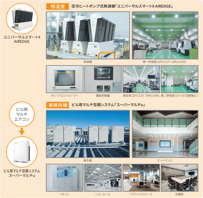 事務所棟空調設備として「スーパーマルチu®」、工場内の評価室・測定室(恒温室)の空調用熱源として「ユニバーサルスマートX AIREDGE」を採用