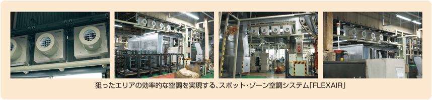 FLEXAIR®工場 富士冷熱工業株式会社様 「FLEXAIR®」と「シングルエース」の導入により、効率的なスポット・ゾーン空調を実現 富士冷熱工業株式会社様 富士冷熱工業株式会社様は空調・冷凍装置用のレシプロ/スクロールコンプレッサをはじめ、空調機用のタンクなどを製造されています。 用途 工場内のゾーン空調 納入機器 スポット・ゾーン空調システム「FLEXAIR®」 RPA-AP281UH×18台 生産工程のゾーン空調としてスポット・ゾーン空調システム「FLEXAIR®」を採用。 実施内容 コンパクトな室内ユニットなので、必要な場所に応じた柔軟な設置を実現 導入効果 「FLEXAIR®」のフレキシブルな設置により狙ったエリアの効率的な空調を実現 1 限られたスペースに効率的なゾーン空調導入を実現 2 ダクト施工などの工事費を抑えた設置導入工事を実現 関連事例 株式会社大和バルブ 彦根工場様 スポット・ゾーン空調システム 「FLEXAIR®」 の設置により労働環境の大幅な改善を実現した事例を紹介します。 FLEXAIR®工場 ホームセンターコーナン 港北インター店 園芸館「Gardens」様 スポット・ゾーン空調システム「FLEXAIR®」の導入で園芸館に最適な空調システムを実現した事例を紹介します。 FLEXAIR®商業施設・ビル ダイシン工業株式会社 鈴鹿工場様 スポット空調機と外気処理空調機の設置により作業環境の改善を実現した事例を紹介します。 FLEXAIR®工場 納入事例一覧を見る 関連製品 スポット・ゾーン空調システム FLEXAIR®